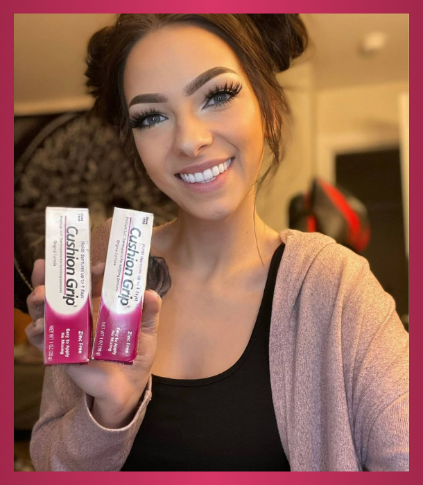 It isn’t a glue adhesive; it works like a soft reline. A single application lasts up to four days and is waterproof, so it won’t wash off during daily cleaning. Cushion Grip adheres to your dentures, not your gums.